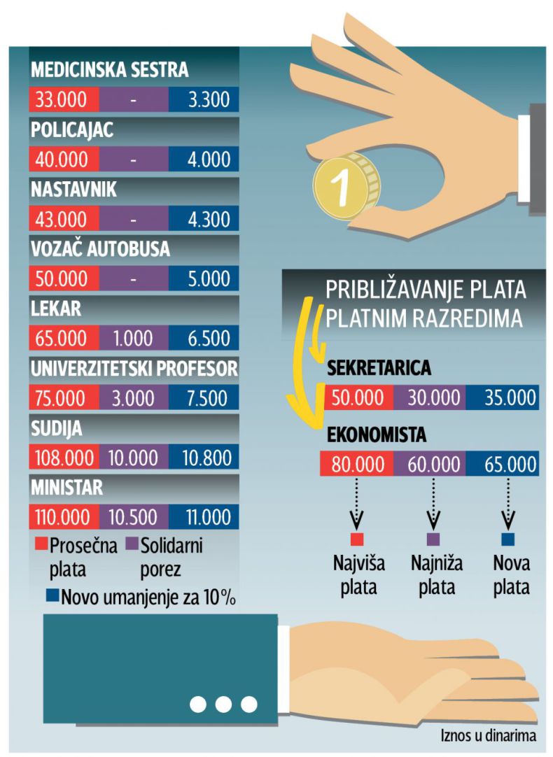 Већ од првог јула плате које се исплаћују из државне касе биће мање за десет одсто. За разлику од досадашњег модела по којем су солидарним порезом биле оптерећене зараде веће од 60.000 динара, нова мера умањиће примања свима коју примају више од 21.000 динара. Опорезоваће се само основица, а не, као до сада, и додаци за дежурства, прековремени или сменски рад.