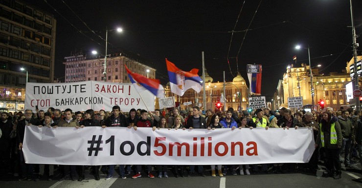 Okupljanje građana na 15. protestu "1 od 5 miliona" počelo je, kao i svake subote, na Platou ispred Filozofskog fakulteta. Odatle je krenula protestna šetnja, a kada je kolona stigla do RTS, u zgradu su ušli lider Dveri Boško Obradović i jedna od organizatorki protesta Jelena Anasonović.