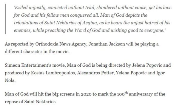 Man of God will hit the big screens in 2020 to mark the 100th anniversary of the repose of Saint Nektarios».